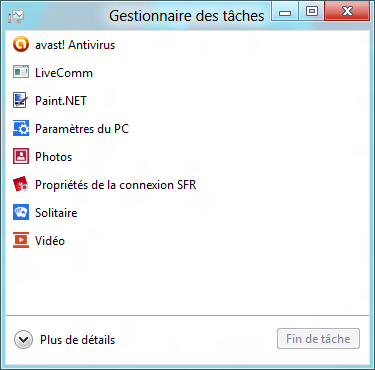 Nous avons vu une nouvelle barre à droite, il y en a aussi une à gauche. Pour la faire apparaître, il faut placer sa souris en haut ou en bas à gauche, puis descendre ou monter sur la coté. Dans cette barre, il y a toujours le retour vers Metro en bas, puis il y a aussi toutes les applications ouvertes en arrière-plan (dont le bureau), excepté le programme ouvert. Malheureusement, les programme ouvert sur le bureau n’y apparaissent pas. J’aurais aimer aussi l’icône de l’application dans un coin de l’aperçu. Lorsque l’on fait apparaître la barre depuis le menu Metro, la dernière application ouverte remplace le retour vers Metro en bas à gauche.