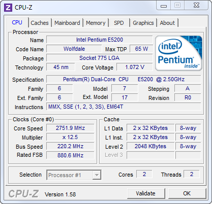 Durant la suite de ce tutoriel, je prendrais comme exemple un** Intel Pentium 4 Dual Core E5200**. C’est un processeur qui possède un coefficient multiplicateur de 12,5 et qui est cadencé initialement à **2,5 GHz**. Je vais procéder un à overclocking de 20% en augmentant le FSB de 200 MHz à 240 MHz pour obtenir une fréquence de **3,0 GHz**.
