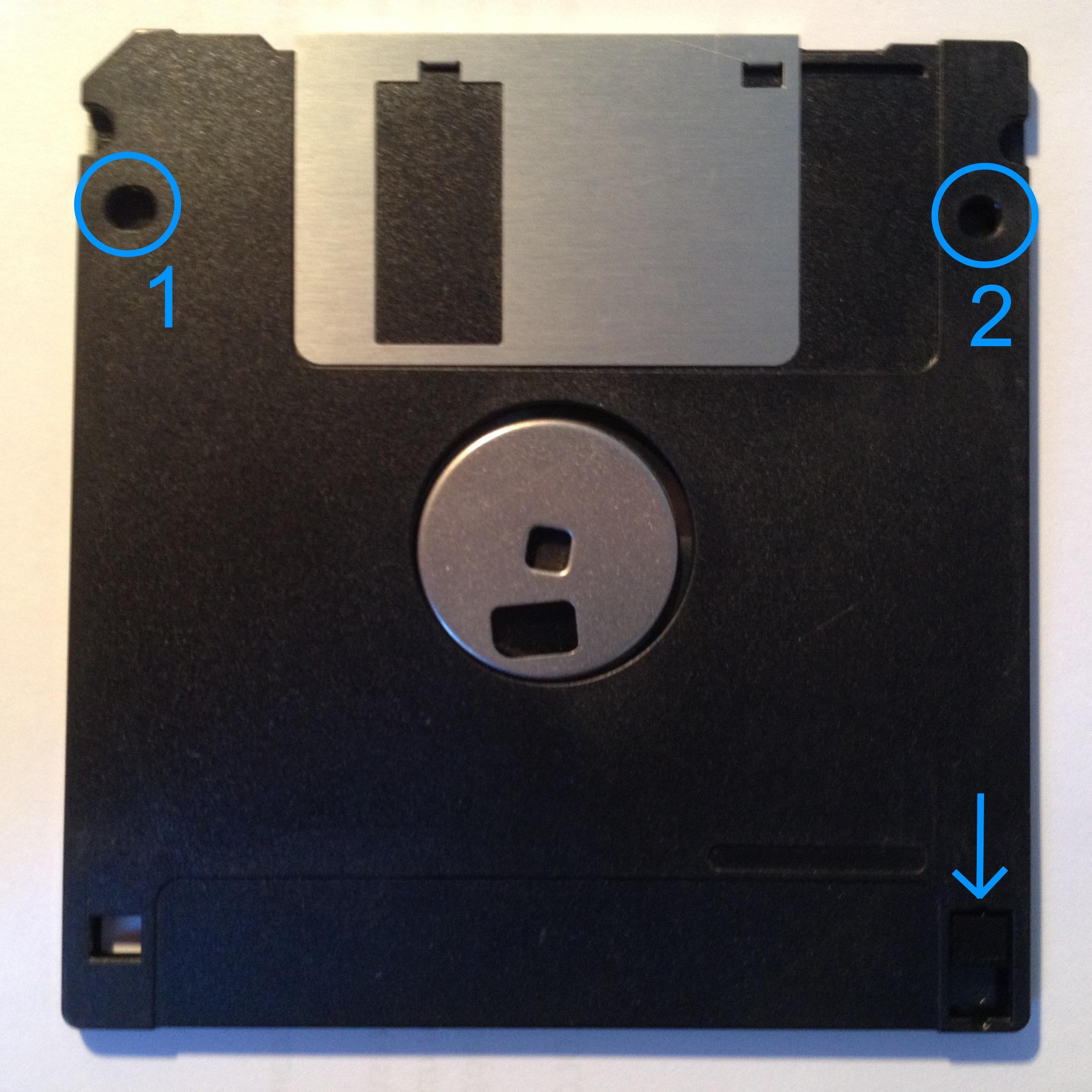 Commencer par relever le cache en bas de la disquette (flèche sur l’image ci-dessous). Munissez-vous ensuite de votre vrille et percez deux trous dans les deux creux en haut de la disquette (cercles 1 et 2). Si vous souhaitez décorer votre disquette, c’est le moment. Il est inutile de décorer la cinquième disquette, puisqu’elle prendra place sous le pot à crayon. Voilà, vos disquettes sont prêtes.