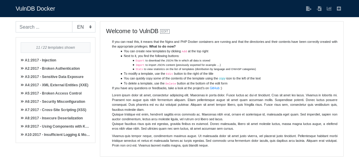 VulnDB est une petite application en PHP/JavaScript permettant de gérer les modèles pour les rapports de mission Pentest. Créez des modèles avec un titre, une catégorie OWASP et une description avec des conséquences et des recommandations, puis copiez-les lorsque vous en avez besoin dans votre rapport de mission.